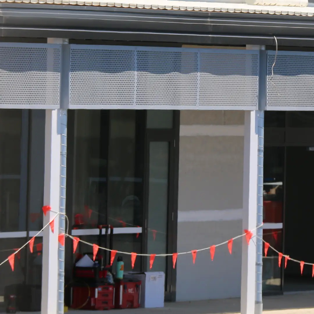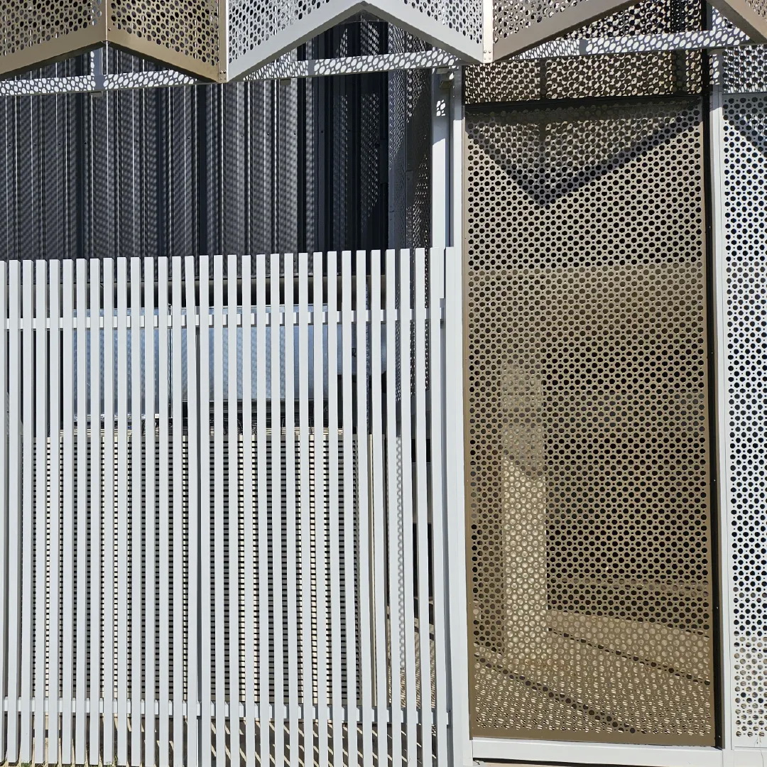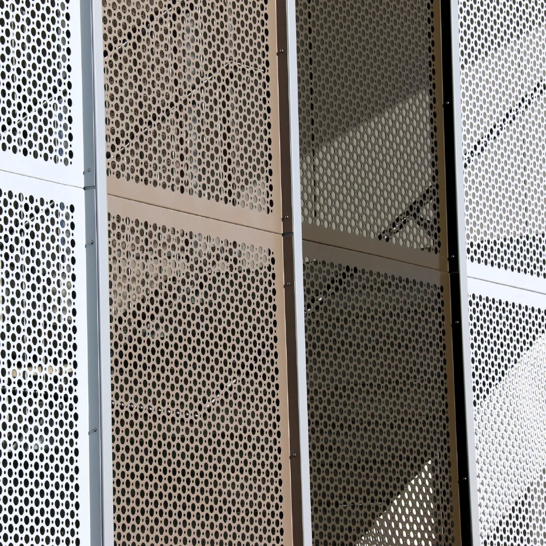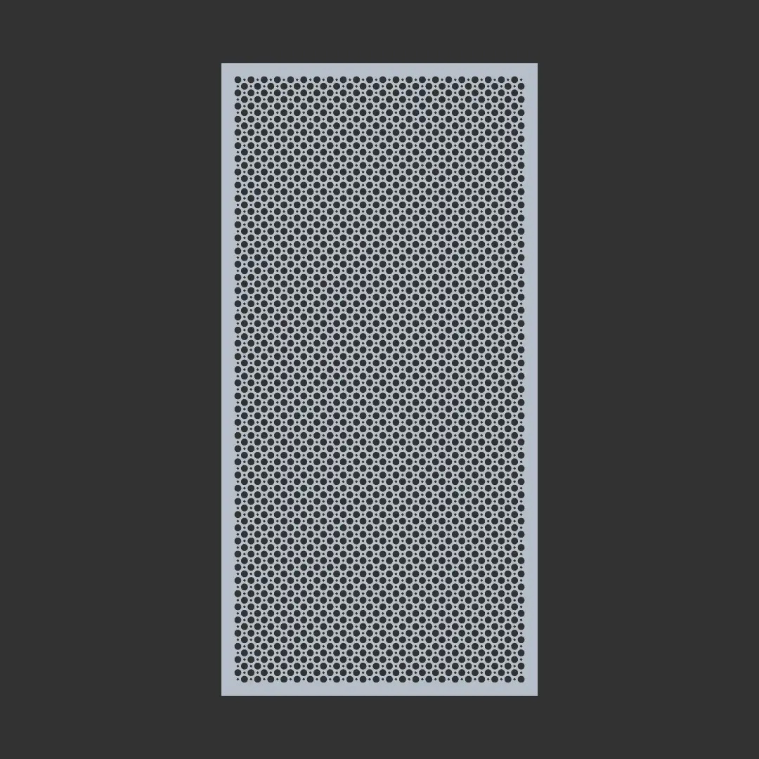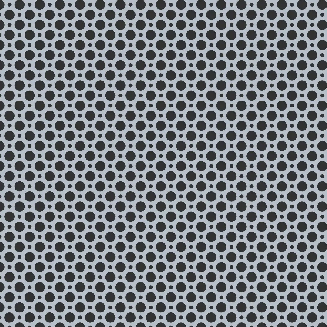 Geometric round pattern. General purpose perforated metal sheet with 2 sizes of holes to create an attractive round pattern. It has a variety of functional uses: Seive, vertical screening, grill, infill panels and is also a great decorative screen.